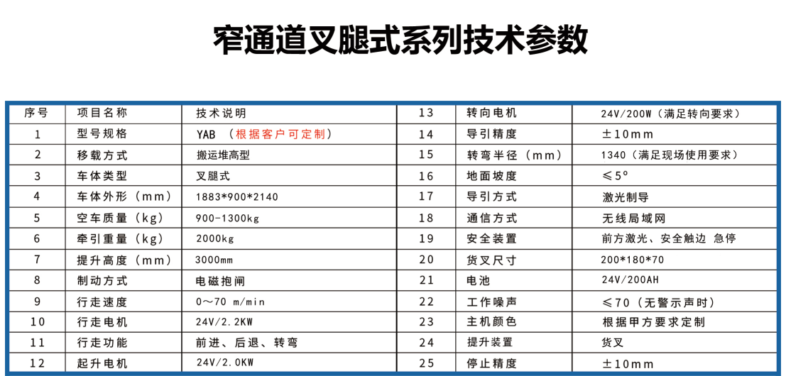YAB叉腿搬运堆高型AGV具有功能稳定、运行可靠、性价比高等多种优势。YAB叉腿搬运堆高型是海玛根据自动化物流系统的取送货要求开发AGV产品,可实现空托盘、实托盘、纸卷等的升降搬运工作。适用于单面托盘形式货物.最小通道只需要2.5米。