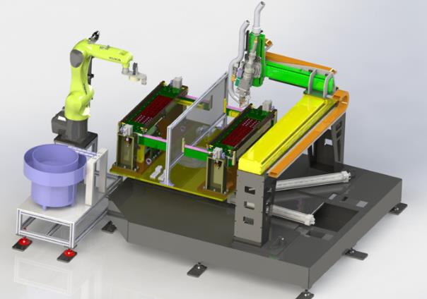 设备内部配置视觉焊缝检查、激光测距,焊接工装清理、焊后除渣等功能,通过视觉引导定位焊缝,实现精确焊接,焊接精度小于0.1mm,产品定位精度小于0.2mm;高度测距仪为机器人提供焊接离焦量;焊接工装清理功能可以实现不停机清理,延缓焊接工装的寿命;焊后除渣可以清除产品上的焊渣和尘埃,提升产品的安装的质量。