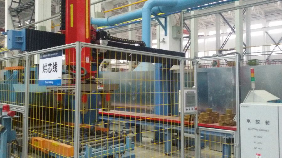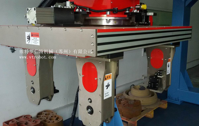 下图为桁架式机器人 一次抓取二件砂芯实现翻转合模