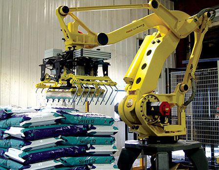 机器人码垛系统是智能高效的码垛机器,因其灵巧轻便的机械机构及灵活的作业动作等诸多特点,而明显胜过框架机械式的码垛机,成为越来越多工厂的明智选择。