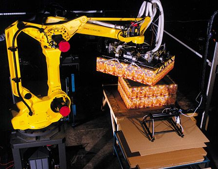 配有全套辅助设备(从集成式空气与信号系统至抓料器),可配套使用包装软件,机械方面集成简单,编程更是十分方便。机器人装箱机采用最先进的4轴、6轴设计,最高具有3.15m到达距离和250kg有效载荷的高速机器人,适于恶劣环境应用,防护等级达到IP 67。机器人的通用性、到达距离以及承重能力几乎可满足任何装箱应用需求。