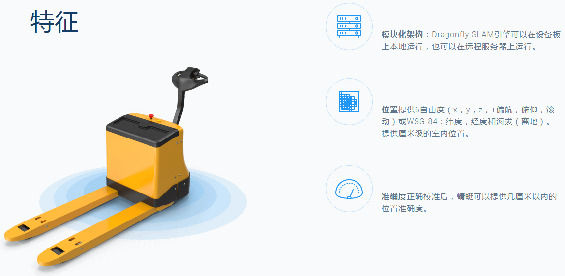 自主机器人:自治自动驾驶机器人通常在零售和医疗保健中使用,可以使用蜻蜓的厘米级精确定位技术在室内和室外导航,并允许实时远程监视其位置。Dragonfly是用于ROS技术的SLAM,因为我们提供了用于集成的ROS(机器人操作系统)节点。