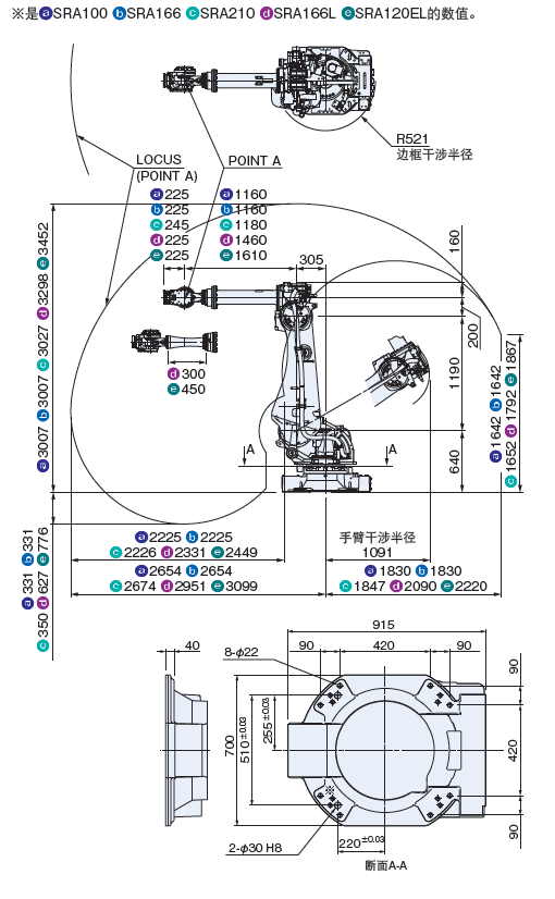| 机器人型号 | SRA100 | SRA166 | SRA210 | SRA166L | SRA120EL | |||