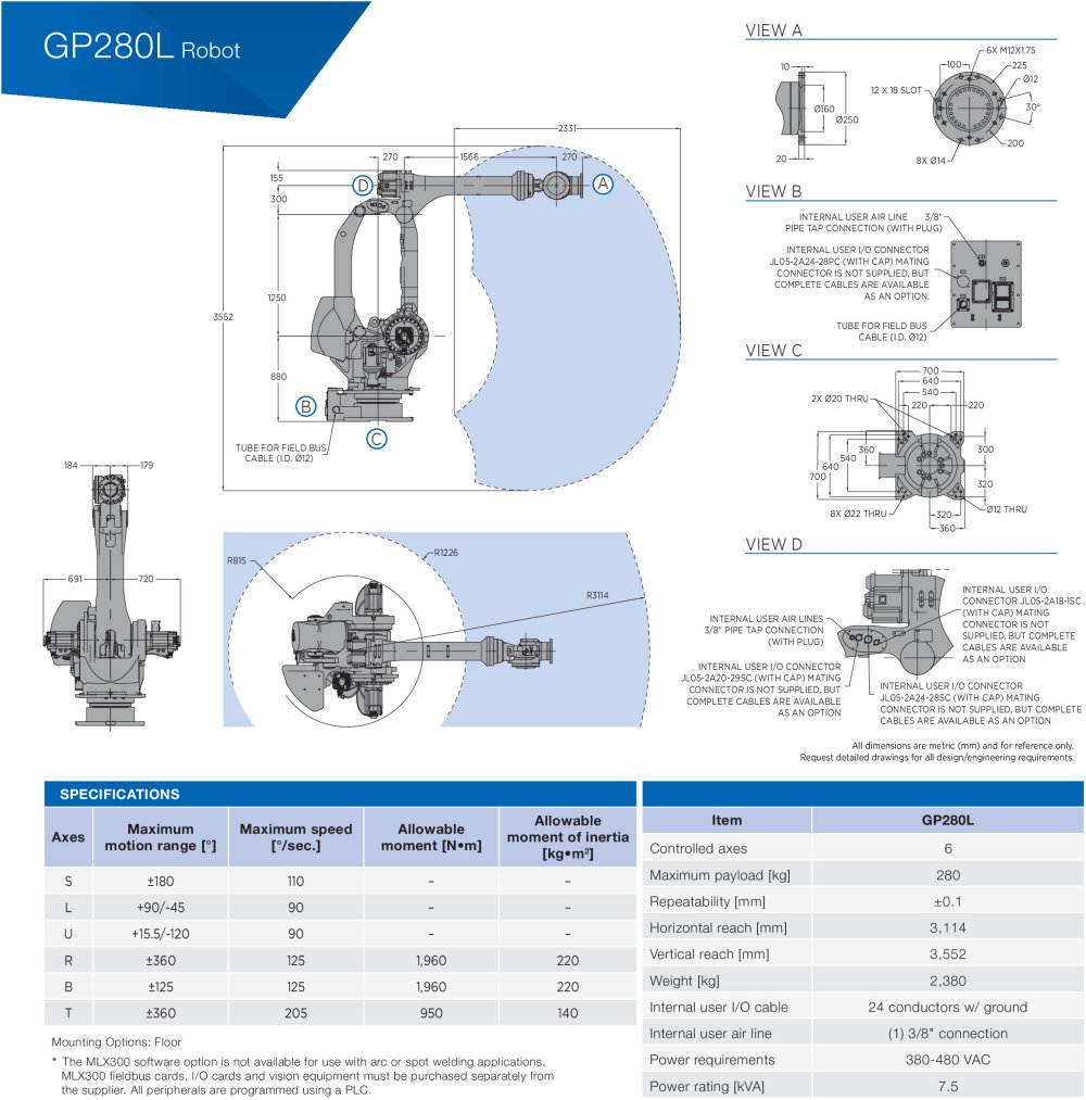 功能强大的扩展型GP280L机器人非常适合无夹具应用,可用于高负载处理任务,具有极快的轴速度和加速功能,可缩短周期时间并提高产量。较高的惯性矩额定值可轻松容纳大型零件,流线型上臂有助于避免对固定装置的干扰,并允许在狭窄空间中轻松接触零件,以实现最佳灵活性。六轴GP280L机器人专为复杂的工作单元而设计,可实现高密度机器人放置,并易于安装和维护。