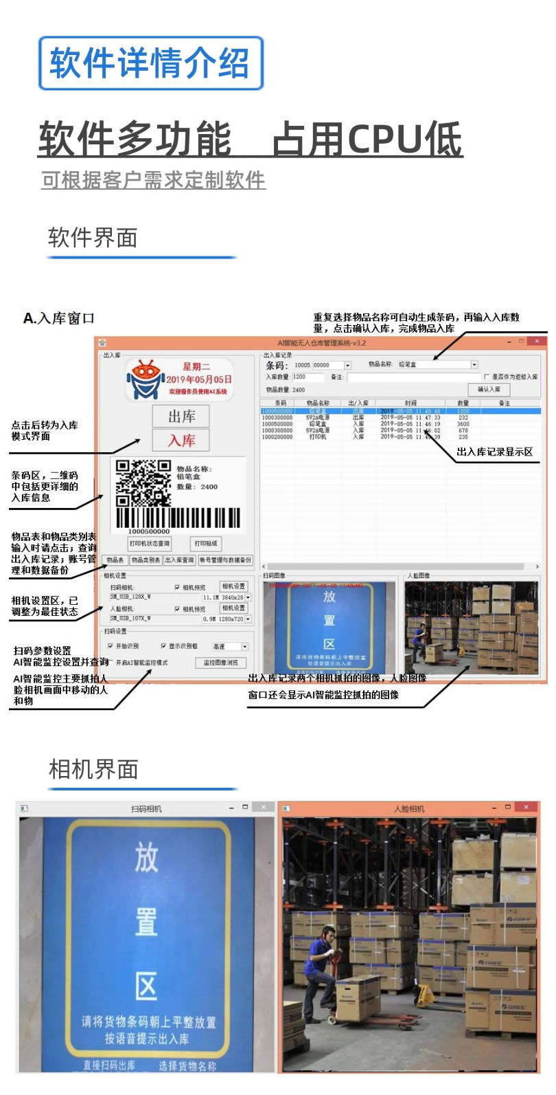配人脸识别相机, AI智能监控模块实时抓拍仓库的人员来往,无关人员后续一查便知