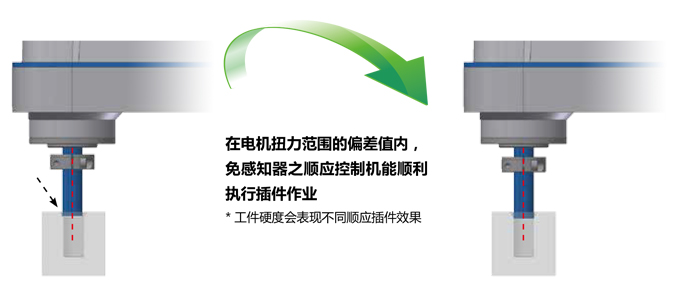 1、具备免感知器之顺应控制机能,可顺应元件与孔位间的偏差。