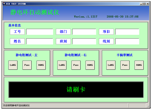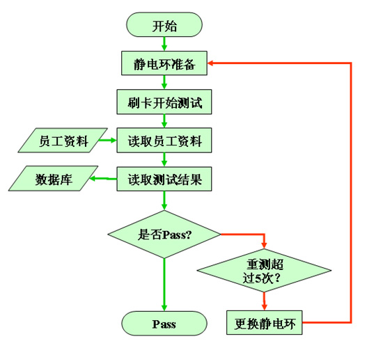 v. 单次测试不通过的信息会保留在数据库中,以备工程师抽检;防止员工用其他人的静电腕带/静电鞋作弊;错误超过5次,会禁止测试,员工需要找工程师更换腕带或静电鞋,测试通过,才可上线。