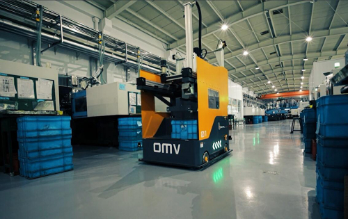 ①从注塑机物料出口的装料框至缓存区采用OMV设备进行无人自动化的转运;