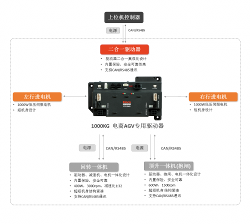 步科开发出了一套针对电商AGV(类KIVA)的驱动+举升方案,这个方案由四部分组成: