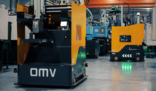 OMV料框抓取机器人工业搬运车辆的一种,实现注塑机工件料框的空框与满框交换、工件满框转运的搬运车辆,主要应用于注塑企业车间等实现自动接送料物流系统。由智能全向移动平台和三轴滑、电动手指、夹爪、电气控制及导航系统等组成。采用伺服电机驱动的麦克纳姆轮作为整车的行走部件,从而可以实现在二维平面内任意方向移动功能,包括直行、横行、斜行、意曲线移动、零回转半径转动等全向移动形式。