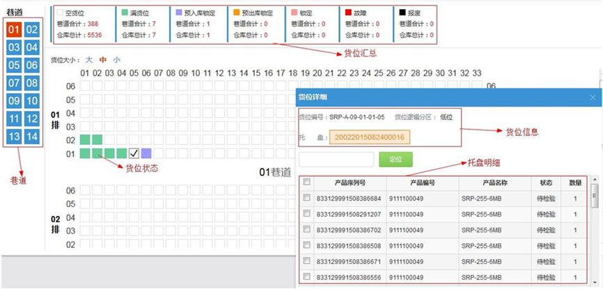 支持按仓库,库存查询仓库的平面储存状态,已不同的颜色标记库位状态(空/不满/满/禁用/ 损坏等),支持单击库位查看产品详情等