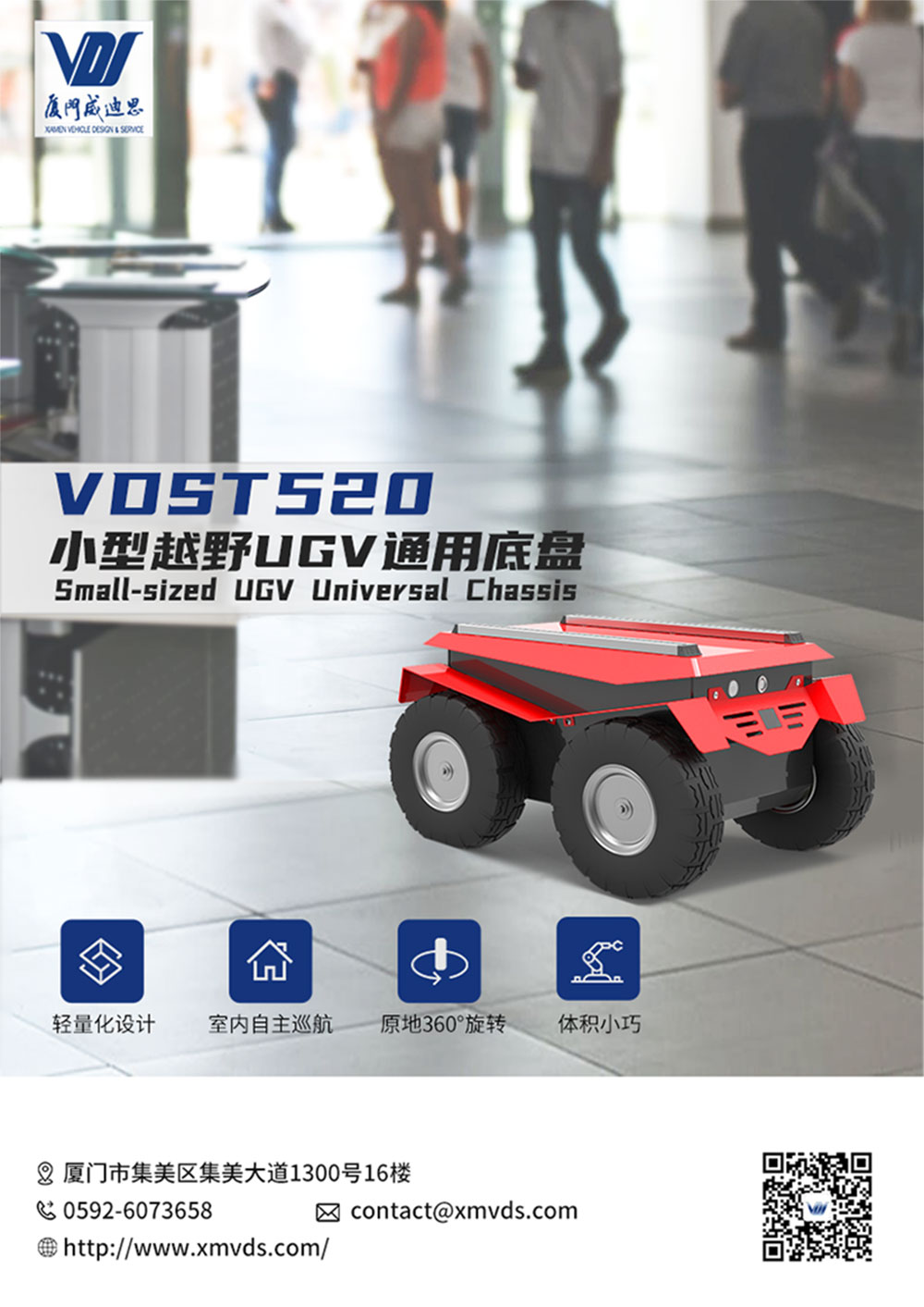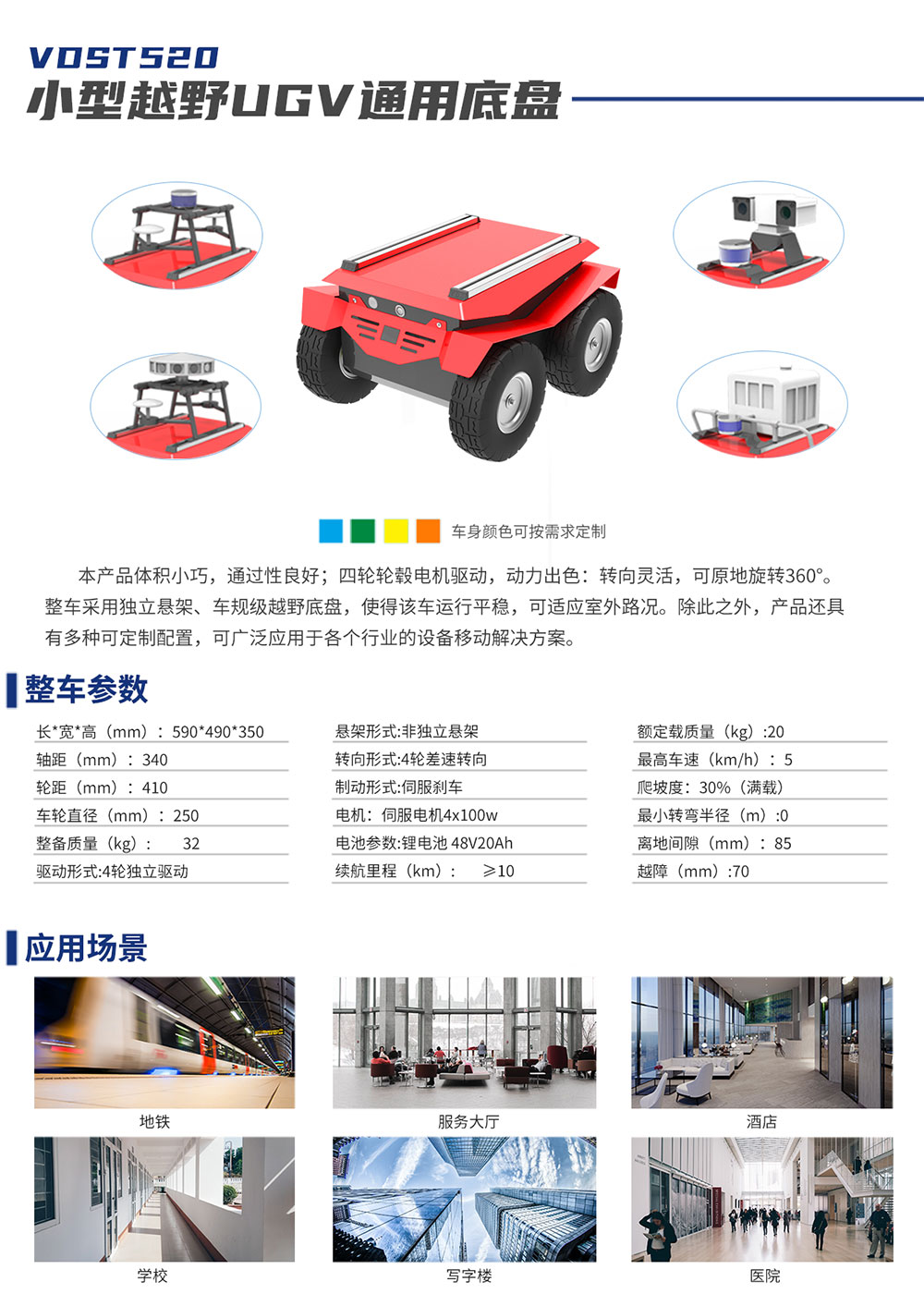 本产品结构紧凑,离地间距大,四轮差速转向,通过性良好;底盘结构采用箱体式,防水性能好,检修维护简单;设置标准的安装接口,方便功能扩展及设备搭载,可广泛应用于室内外巡检、教学演示等场景。