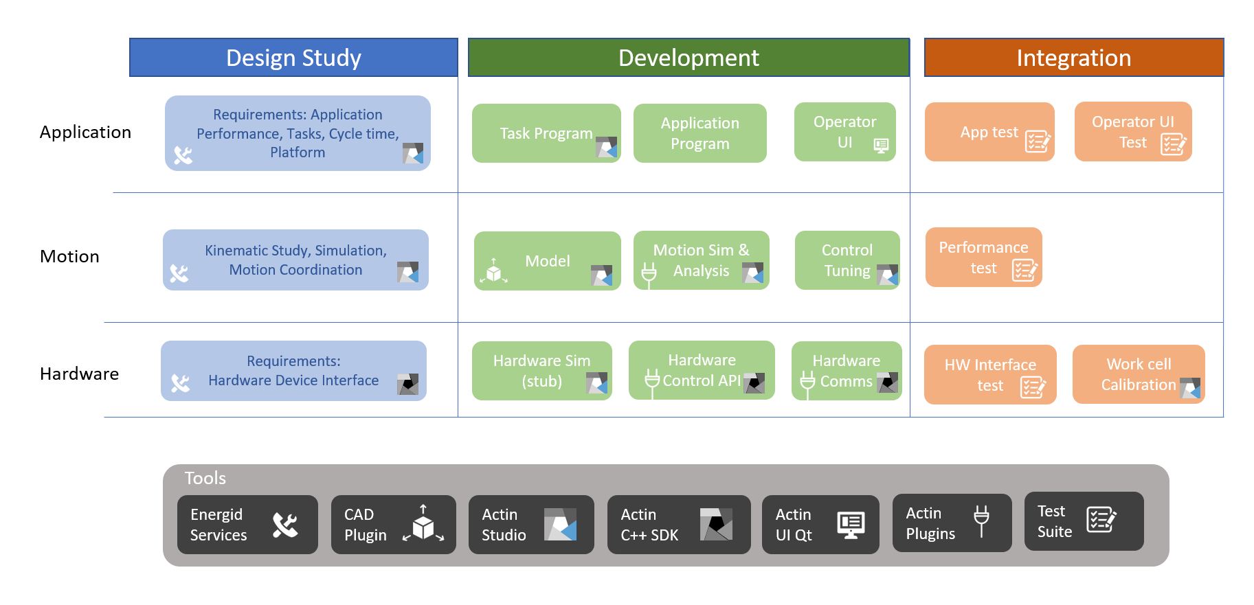 Actin SDK 可用于为机器人应用程序、运动和硬件创建实时控制器。Actin 的系统任务、控制和模拟功能构成了机器人系统开发团队可以从设计到集成使用的框架。