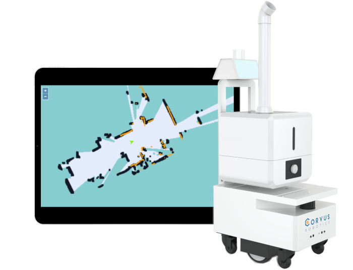 达到比 UVC 机器人更广的影响范围,在数米外喷洒消毒剂。