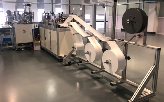 • 全自动一次性平面口罩生产线主要包含卷料上料、折叠压合、鼻梁夹上料、口罩成型、口罩切断、耳线上料焊接、成品下料等工艺。