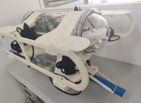 海参捕捞机器人是一款可通过手机APP进行遥控捕捞海参的水下机器人,海参捕捞机器人配置六个矢量分布的大功率无刷推进器,可实现360°全向移动,控制灵活,最大下潜深度可达100m。机器人前部配置高清摄像头,可在水下进行连续观测,机器人还挂载了一个捕参仓,配置大功率吸参泵,可捕捞大于5公斤重量的海参,吸参管通过机械手控制吸参方向,可实现多自由度捕捞海参。
