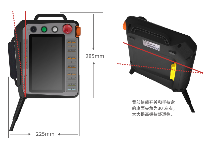 背部使能开关与示教器底面夹角30°,大大提高舒适性