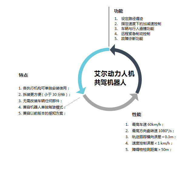 根据需求,建议采用艾尔动力驾驶机器人V2.0版本,V2.0机器人是一款符合人机共驾模式的自动驾驶机器人系统。与之前版本相比,具有以下一些特点: