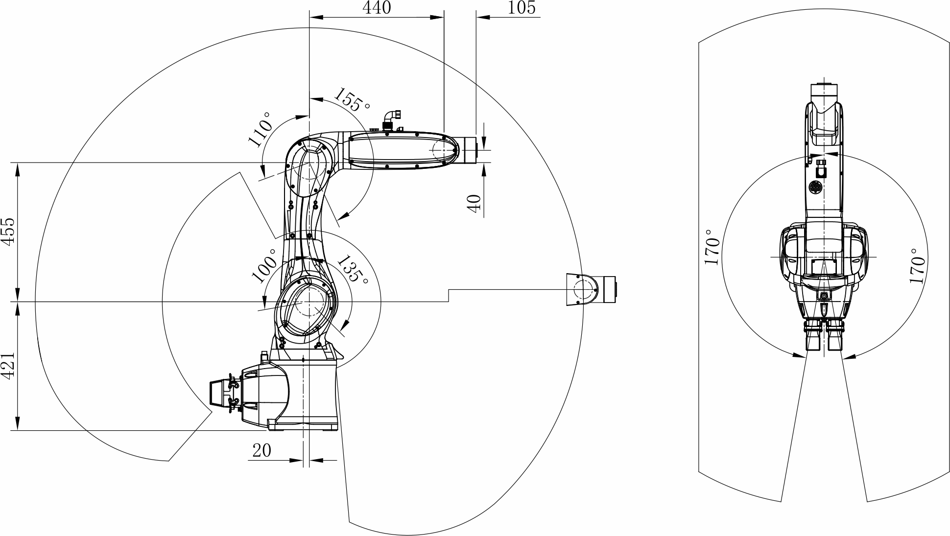· 手腕负载容量大,额定负载6KG,可以轻松应对多种应用场合。搬运机器人