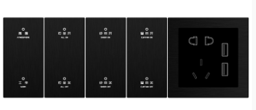 床头面板组合包含了【灯光模式+窗纱帘控制+五孔USB插座】,安装位置在床头附近,配备插座的组合式面板,满足客户电子产品充电及使用电脑等产品