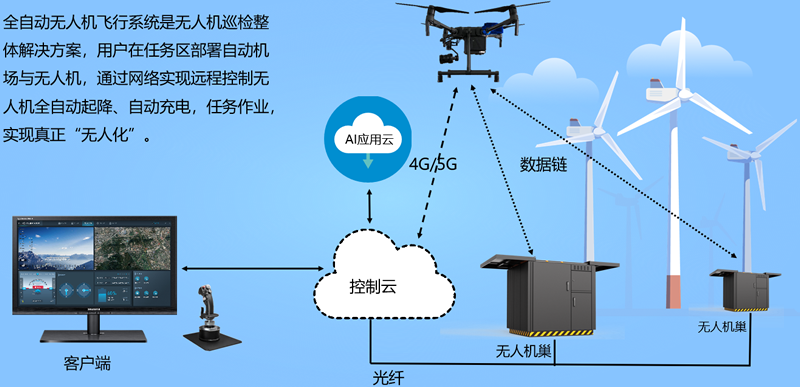 全自动无人机飞行系统是无人机巡检整体解决方案,用户在任务区部署自动机场与无人机,通过网络实现远程控制无人机全自动起降、自动充电,任务作业,实现真正“无人化”。