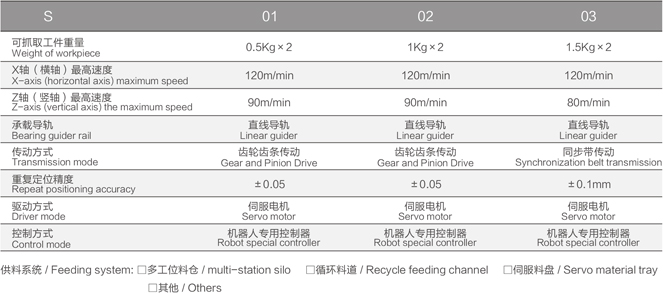S05系列单机外置式机器人,采用门式两轴结构,可以独立安装到地面,也可以安装固定在数控机床上。该系列机器人特别适用于单台数控机床加工单工序零件的场合。