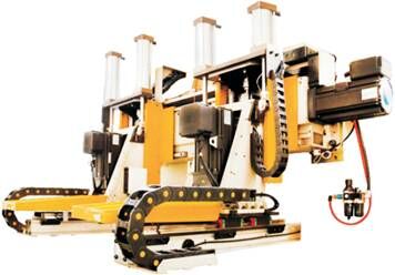 由主机、辅机、输送杆、自动换杆系统、移动操作台等组成,利用特制夹具夹取工件,通过预设运动曲线,进行X轴、Y轴、Z轴三个方向的运动,与冲床实现同步运行,将工件在大型冲床内各模具之间作精密定位移送。