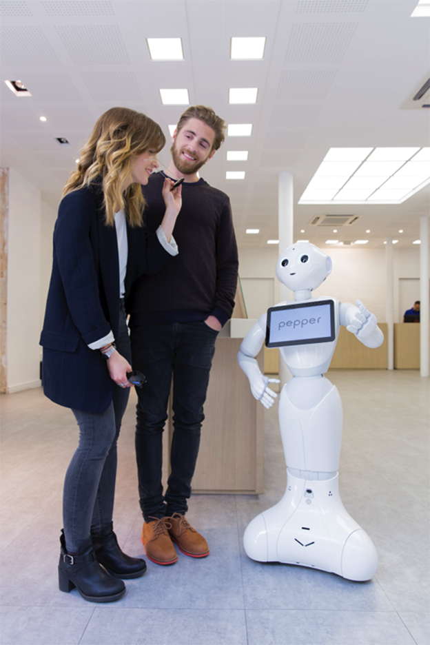 Pepper通过视野系统来察觉人类的微笑、皱眉以及惊讶。The Pepper robot uses its visual field system to detect human smiles, frowns and surprises.