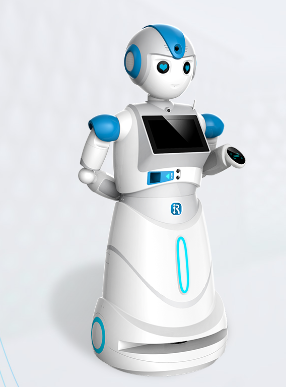高科技感的仿人型外观可通过灵活的头部运动和丰富的眼晴表情屏来表达机器人丰富多彩的表情和辅助服务,实现机器人的情感交互。