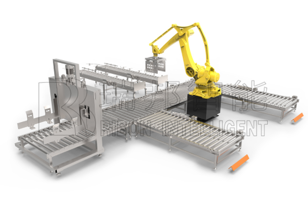 自动码垛系统,主要由进料输送线、码垛机器人、自动供栈机、栈板输送机、栈板转向输送机、码垛工位输送机、出垛垛工位输送机及智能控制系统等模块组成。主要功能将包装成箱的终端产品,按照预设码垛堆放形状(码形)和层高整齐堆放在栈板上,并输送至规定工位。该设备主要适用于纸箱、周转箱、袋装类产品进仓前的码垛工序。