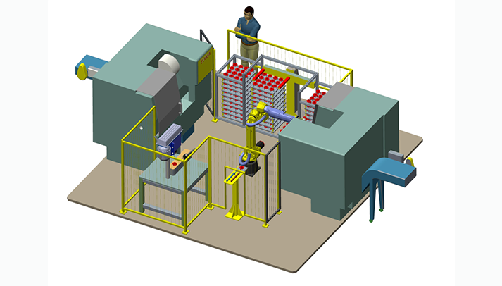 本系统采用品字形岛式布局,一台M-20iA机器人服务两台现代威亚E200A数控车床和一台钻孔攻丝专机(西班牙)自动化上下料作业,同时配置带有立体式料仓,可满足约3小时的无人化生产。