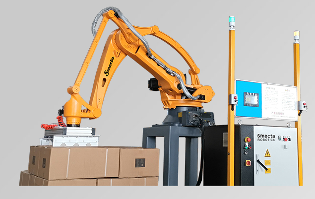 ER120码垛机器人臂展2400mm,负载能力120KG,可码六层化纤纸箱,符合行业码垛需求,应用广泛。系统是集硬件和软件为一体的整体解决方案,客户购买设备进行配线安装,无需进行程序开发即可使用。配合夹板式、吸取式、夹爪式等工装,可以将前端包装生产线输送来的箱体、瓶类、袋包等物料,按照客户要求自动堆叠成垛,同样适用于食品、3C电子、家电等行业产品种类多,有混合码垛需求的企业。