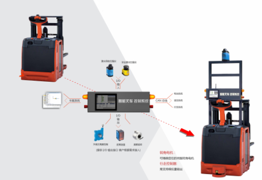 通过加载激光导航控制系统,将客户的原有叉车进行改造,只要客户的叉车驱动总成是电转向功能的,就可以将普通的叉车变成激光导航的无人自动叉车,可以实现降低制作成本的30%-50%,甚至更高。