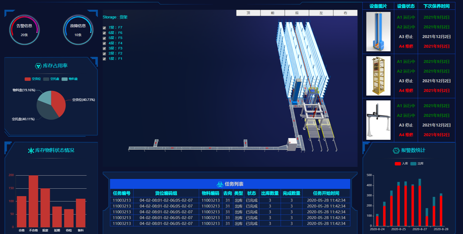 提供自动化立体仓库三维展示,通过wms系统同3D系统对接,实现实时查看立库设备的运行状态,货位存储情况以及货位利用率