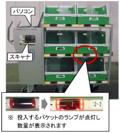 拣选产品并扫描条码后,待装桶上的灯亮起并显示数量。装入产品后,按下指示灯继续下一个操作。