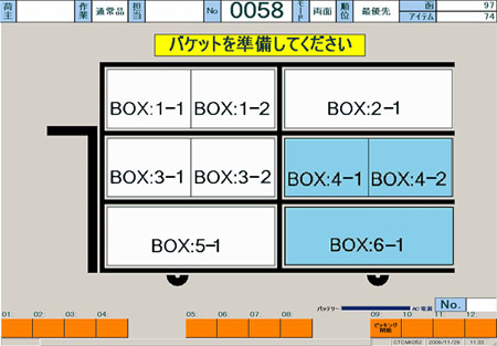 在计算机屏幕上,系统从货架移动导航到产品装载到桶中。