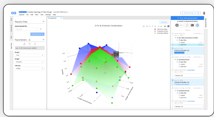 使用 Code Ocean 计算工作台应用程序面板,研究人员通过生成易于使用的点击式 Web 分析应用程序并将其发布给科学家团队来共享结果,而无需任何 IT、编码或使用命令行。