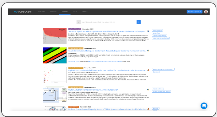 Code Ocean 拥有一个开放的公共胶囊存储库,用于存储来自全球计算研究社区的发现。个人研究人员发布并访问数千个组织和保存的研究结果,以便快速共享和重用。