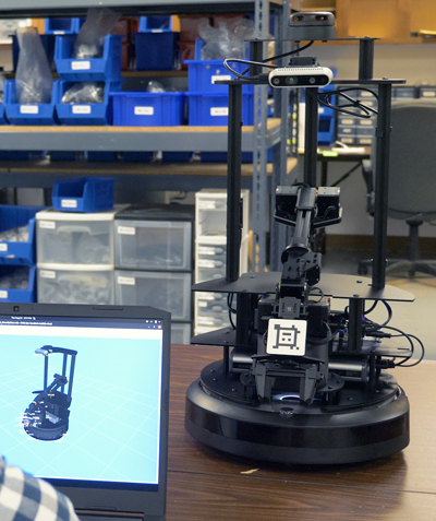 安装在可控平移和倾斜机构上的立体深度摄像头和可选的 2D LiDAR 为 LoCoBot 提供 360° 的周围环境视图,用于地图绘制、导航、操纵和感知。深度相机提供彩色图像、深度图像、点云和实时相机馈送,而激光雷达则产生激光扫描或生成的点云。