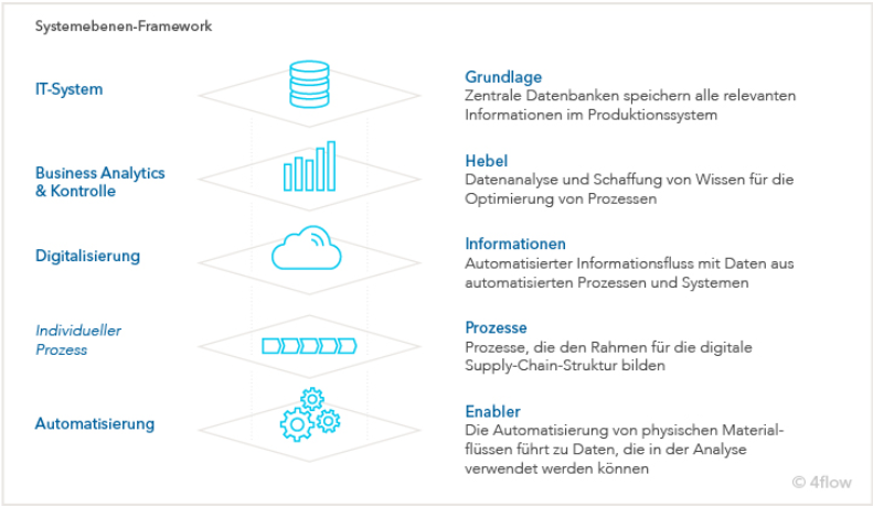 4flow帮助企业确定其个人在此结构中的现状,制定目标形象,并在物流4.0的道路上制定明确的下一步。具体而言,这意味着IT系统,自动化解决方案,识别技术和数字控制的集成,以及在流程链中的业务分析和控制应用程序中利用数据。凭借其久经考验的系统级模型,4flow以结构化的方式将各个相关级别结合在一起。