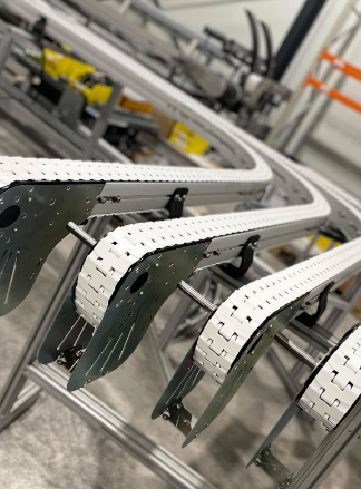 桌面系统基于紧密贴合的 multiflex 塑料链式输送机,可以水平和垂直运行。基本型链式输送机的宽度范围为 80 至 200 毫米,长度可达 30,000 毫米。支撑框架基于阳极氧化铝或不锈钢型材,链条由白色聚缩醛材料制成,带或不带摩擦顶部。