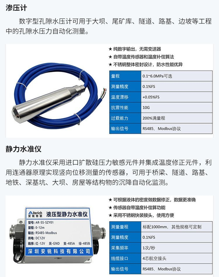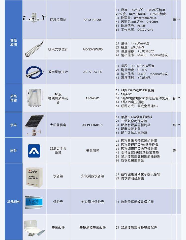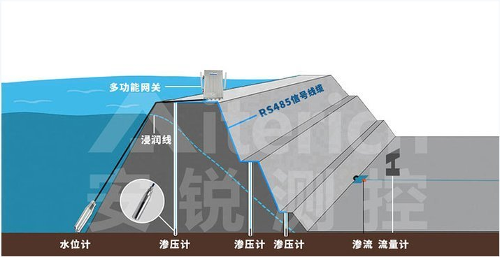 在大坝安全自动化监测系统建设中,应根据坝型、坝体结构和地质条件等因素选定监测项目,主要针对大坝的渗压、位移、沉降、应力等物理量,可用于这类监测项目的传感器和设备种类繁多、型号各异,因此在进行传感器设备选型时要重点考虑量程、灵敏度、精度以及工作环境等因素,同时为了方便管理,利用系统监测中心实施对所有前端传感器设备、采集网关、云服务器及安锐测控云平台进行统一集中管理。