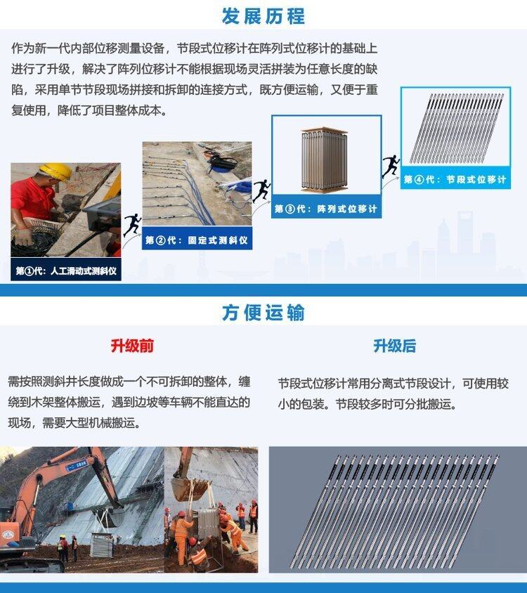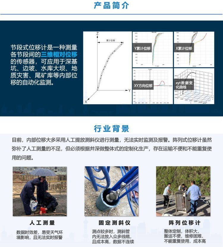 节段式位移计是一种测量各节段间的三维相对位移的传感器, 可应用于深基坑、边坡、水库 大坝、地质灾害、尾矿库等内部位移的自动化监测。