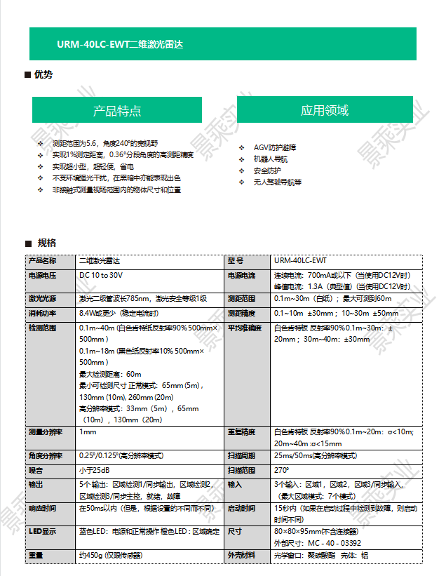 HOKUYO北阳 机器人 无人驾驶导航 安全防护 AGV避障 2D激光雷达 URM-40LC-EWT