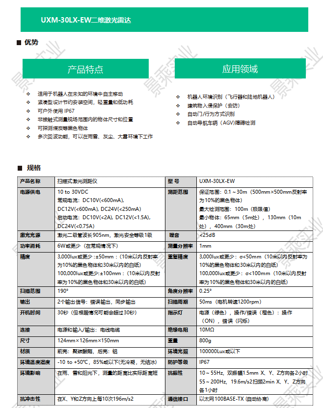 HOKUYO北阳 环境识别 安全防护 AGV障碍检测 障碍物检测传感器 UXM-30LX-EW