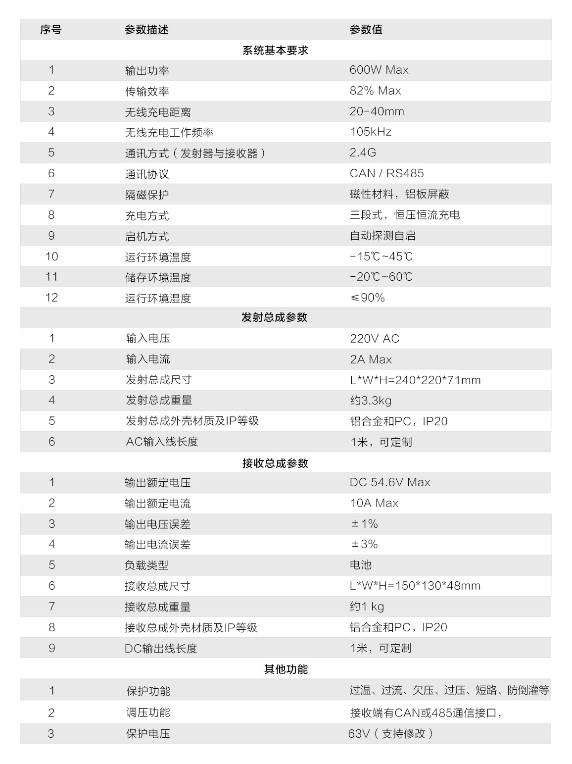 赫兹创新HzWP- SS060型(一体式)无线充电电源系统是一款基 于磁耦合谐振式技术的无线充电电源设备,可以为直流用电设备提供非接触式充供电,用电设备可以是使用锂电池、磷酸铁锂、铅酸电池等装置,也可以是阻性负载等。