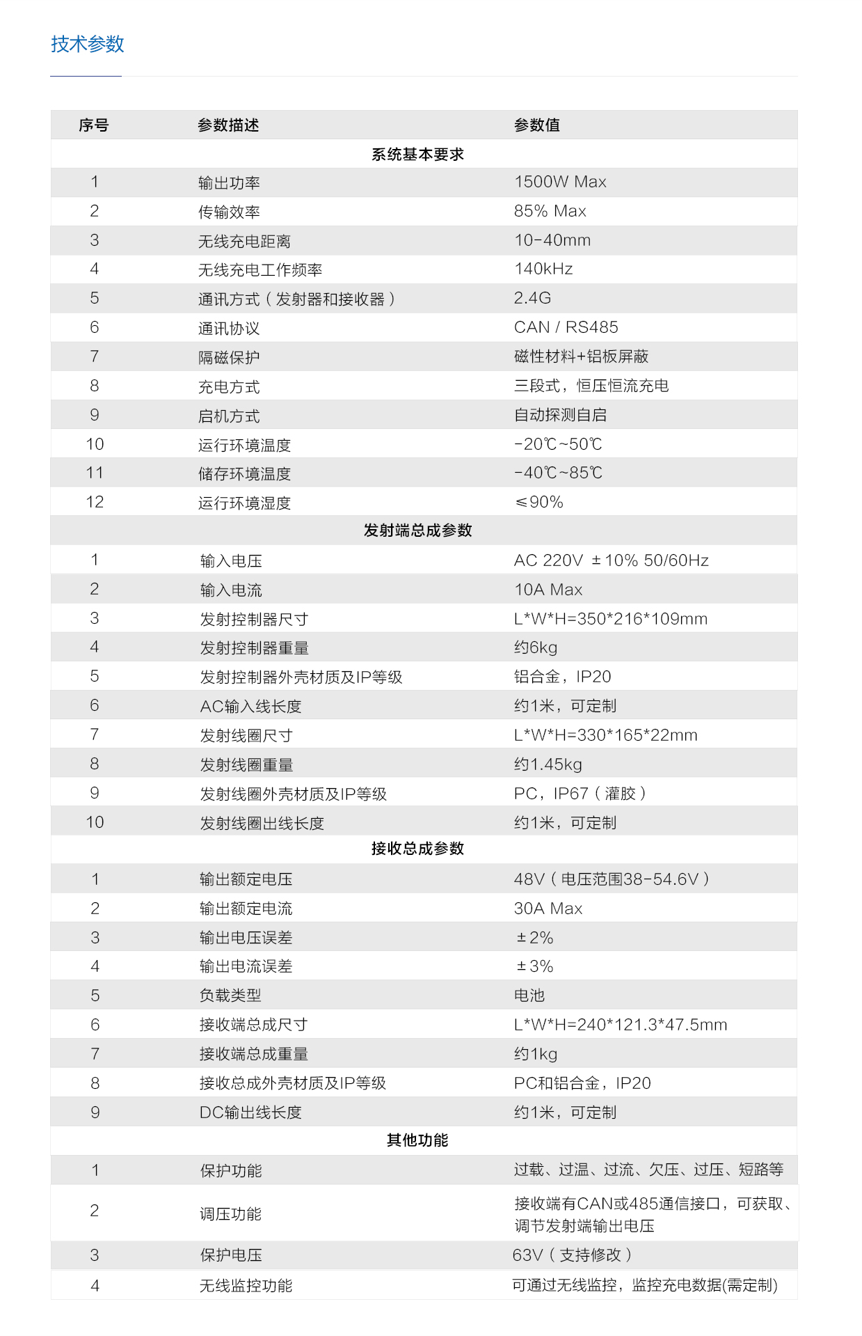 赫兹创新HzWP-LC150-A30型无线充电电源系统是一款基 于磁耦合谐振式技术的无线充电电源设备,可以为直流用电设备提供非接触式充供电,用电设备可以是使用锂电池、磷酸铁锂、铅酸电池等装置,也可以是阻性负载等。