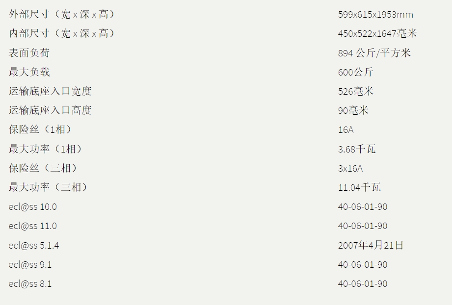 内部尺寸:宽 x 深 x 高(毫米)450 x 522 x 1647