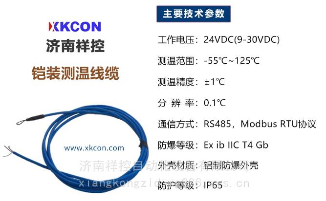 济南祥控自动化设备有限公司研制的XKCON祥控铠装测温线缆配置进口温度传感器芯片,具有反应快、测量精度高、抗干扰能力强等特点,测温范围为-55~125℃;测温电缆内至少包含一个温度传感器,在选购时,用户需根据实际测温场所要求,根据需要配置温度传感器的个数。