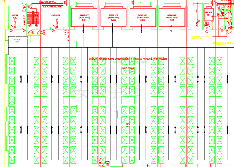 出入库流程:WMS下发入库任务,由宇锋自主研发的调度系统控制电梯开门,下发取货信号给车载系统,车载控制AGV由1号电梯内(共4个)取货放入库区,完成入库;出库则由AGV从库区取货,放入1号电梯内,AGV搬运动作完成(如图)。